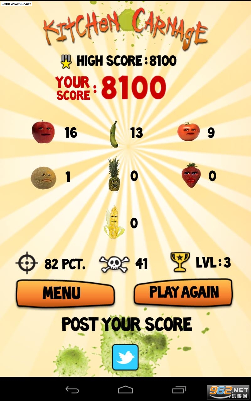 《讨厌的橘子AO Carnage》是一款快节奏街机风格的休闲娱乐类游戏。游戏中的场景设置在不多见的厨房中,你需要将苹果、香蕉、哈密瓜等水果送到搅拌机中榨成果汁,每种水果都有各种猥琐表情,就连叫声也是极度猥琐,让人忍俊不禁。 游戏开始时就面对橘子的表情,让人满脸黑线,只能说太猥琐了,原来外表温顺的水果也可以这么猥琐。 游戏的风格很写实,诸如苹果啊、香蕉啊、橙子啊等等,都刻画的很真实。道具方面主要是榨汁机,只要掌握好力度就能把这些猥琐的水果扔进去,然后榨成果汁。 水果除了表情猥琐,就连声音都极其猥琐,有时候你在扔出它们的时候,它们就会大叫,还会装可怜。 看到这里你是不是也hold不住了?不信就来试试。