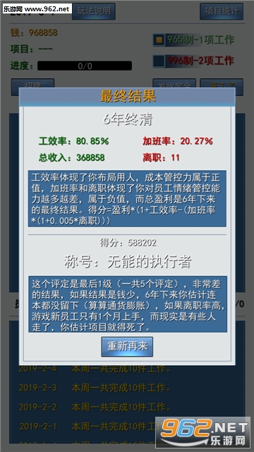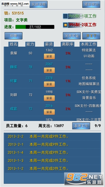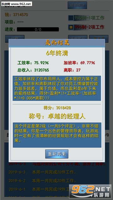 这是一个模拟经营的文字小游戏。这部是老板篇,主要模拟经营游戏开发过程中如何把控员工情绪,提高工作效率,追求最大利益的一个过程,看看最终你会是一个什么结果。后面还计划做一个打工篇,然后从2个角度来看待996的问题。