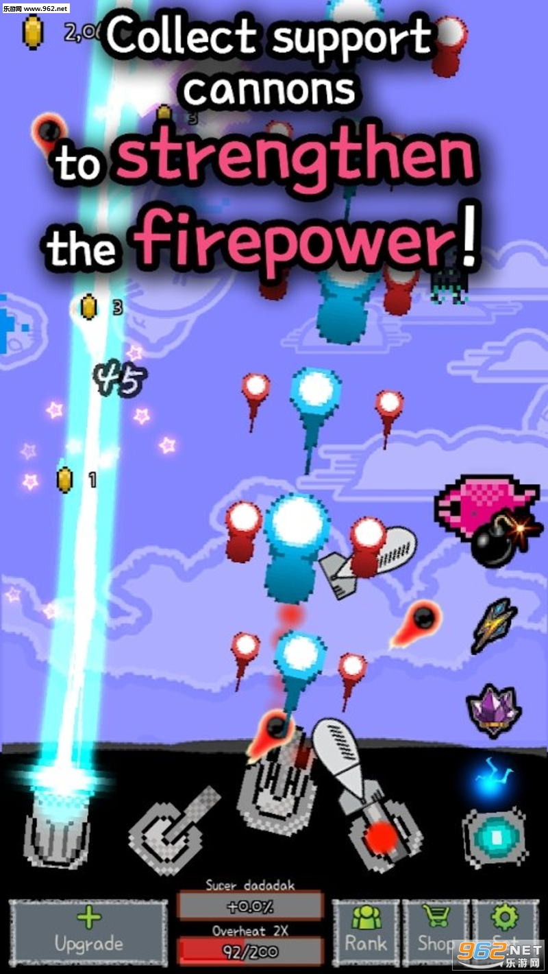 玩起来非常有意思的一款像素风射击闯关游戏,不断的升级你的主炮,口径就是正义,还可以建立各种各样的副炮来分担压力,游戏的难度不高,推荐给喜欢休闲游戏的玩家。