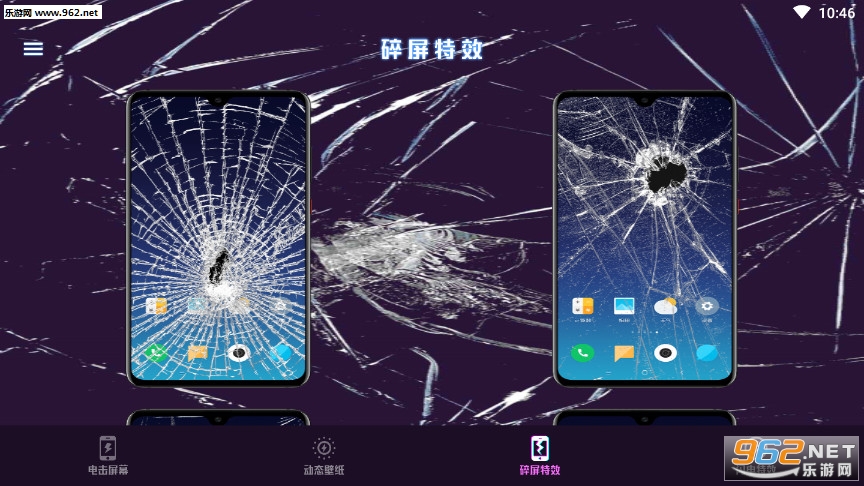 开启应用,设置碎屏特效。用手指触碰屏幕时听见”砰“的一声,屏幕玻璃”碎裂“了。
