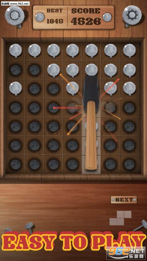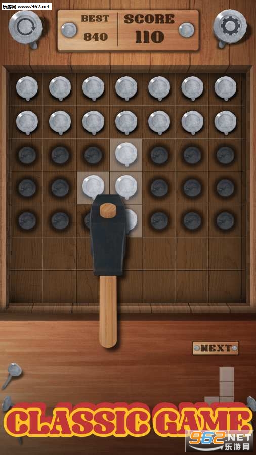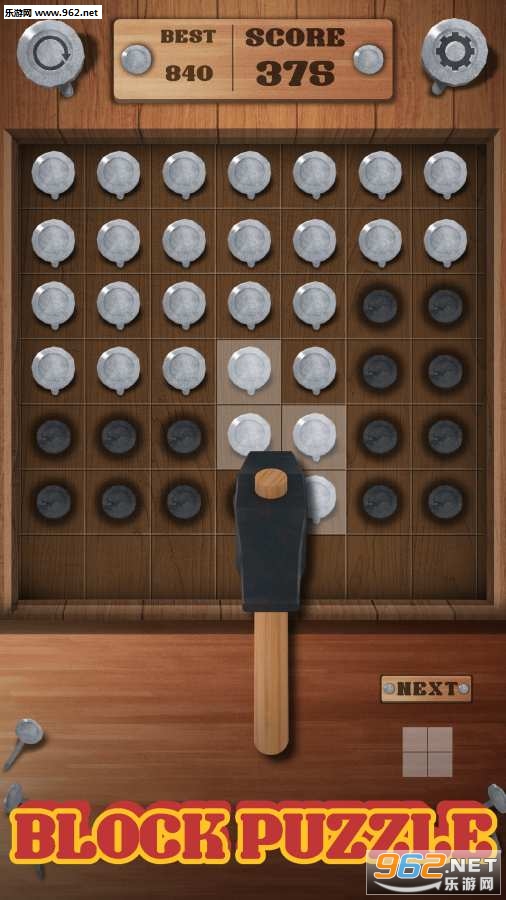 《锤击方块Hammering Block Puzzle》游戏是111%开发出来的一款新品手游,用锤子来锤击钉子进行消除吧,不能够让钉子到最底下的部分去了,不然的话游戏也就结束了哦。
