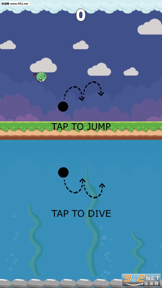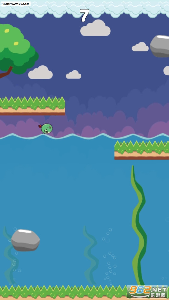 和很久以前的一款游戏很相似,都是采用了点击跳动的一个方法,游戏难度真的很高,所有不是天空和水域的色块都会让游戏直接结束,加上水中和天空中相反的操作使得错误率提升,推荐给喜欢休闲跑酷游戏的玩家。