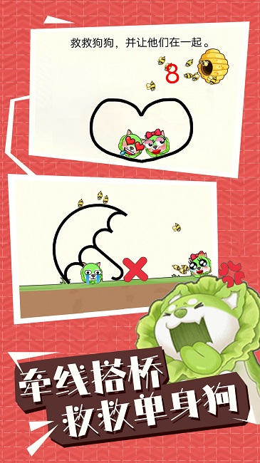 帮帮小动物游戏是一个趣味性的绘画游戏,游戏中有很多不同的关卡可以尽情挑战,在这里大家只需要通过头脑不断思考闯关办法,通过绘画来解救菜狗。游戏中结合了多种玩法于一体,让广大用户既能感受闯关乐趣,也能体验到绘画的趣味性玩法。