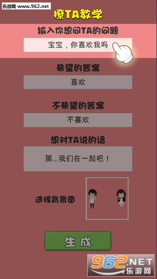 总体来说是一款非常不错的互动休闲类的游戏,属于双人的游戏,也是情侣间增加感情的游戏,反正大家都是要玩手机的,不如利用这个小游戏来增加以下双方的感情不是更好吗,操作简单,设置问题和答案给你的另一半去点击即可,喜欢的亲们赶紧下载吧。