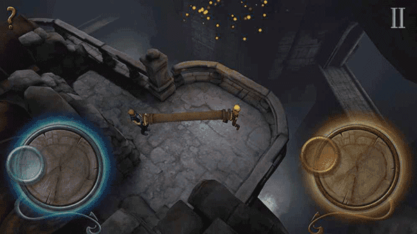 step10.让哥哥站在拉杆台子守候,然后操控弟弟来到圆坛四个铁链火炬台前呼叫,然后守卫巨人就会撞击火炬台从而导致铁链断裂;铁链断裂,哥哥就可以拉动杆子打开中间的井盖。