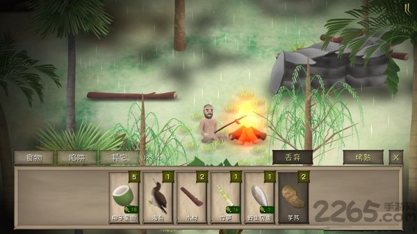 肉食来源:竹叉干椰子蟹和大龙虾,石头砸四脚蛇和螃蟹,掏鸟蛋;做椰子蟹陷阱抓椰子蟹,做双绳陷阱捕捉野猪海鸟,做大鱼网抓大龙虾和海鲈鱼,做猎杀陷阱干鳄鱼。