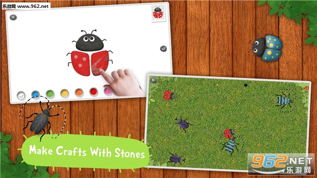 在这款游戏里,孩子们可以学会用鹅卵石制作各种有趣的手工(昆虫、花卉等),并和他们的作品进行互动!