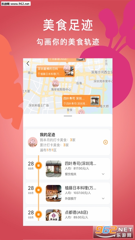 把你的每一次打卡都捕捉下来。在你的美食地图上,插上一个又一个旗帜,勾画出一条专属于的美食轨迹。让刷吃陪你,将大江南北刷遍~