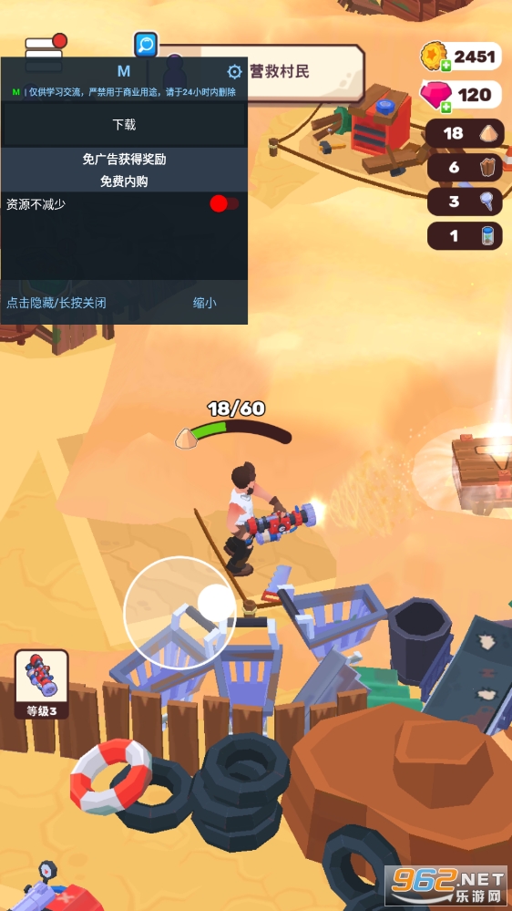 打开废土生活,过完教程后,通过虚拟摇杆控制角色移动,使用手中的吸尘器收集沙土,清理道路