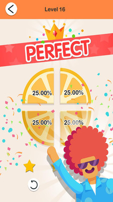 在每个级别,有一个规则的形状,你只需要将它切成相等的两个或四个 切片。切片的面积越接近,你就可以得到更多的星星! 三星不是你的目标!真正的挑战是切割完全相同的切片! 让我们来看看你能切得多完美!