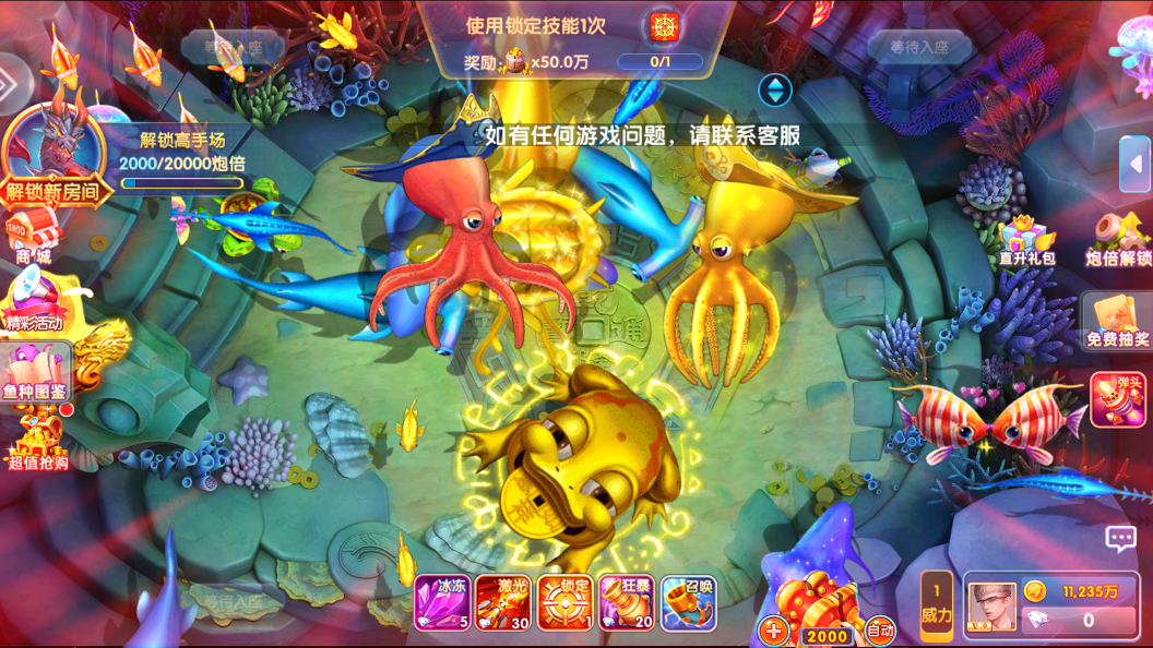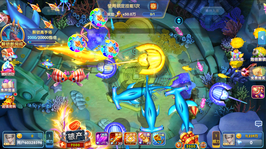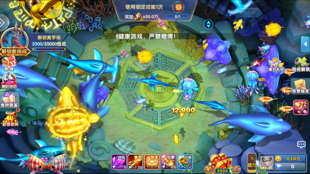 2、金币不多时,建议多捕获小鱼,慢慢积累金币,等到积累一定程度之后,一般鱼群也刚刚好出现,这个时候一定要把握好时机,将鱼群收入囊中,使自己的财富更进一步,然后把目标对准BOSS,一步一步往高处走。