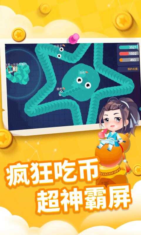 带着你的蛇宝们去淘金吧!《贪吃蛇进化论》是一款既能享受轻松休闲的放置合成,又能体验紧张刺激的IO对战游戏!两种玩法,新奇上瘾玩个不停!控制摇杆走位你的小蛇,吃掉地图上金币,就会变长。长按加速,用巧妙的走位让蛇身被别人撞上,就可以吃掉对方收集的金币迅速变长。想拥有各种各样的小蛇?轻轻挪动手指,把相同的小蛇合成起来,解锁更多更强的蛇蛇!战神吕布、齐天大圣、元气少女、琵琶仙子。拇指移动之间,统统拥有!