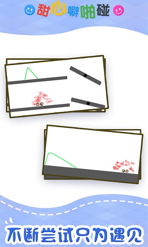 还等什么,快快加入甜心噼啪碰,设计爱情线,让相爱的ta们在一起!恋爱闯关100次,每闯过一关,就会与ta心灵碰撞一次,闯过100关,恋爱百分百,就是你们收获幸福的时刻了。现在是时候用2265玩家的智慧去找到一个方法去撞击ta了!规则很简单,只要设计并画出爱情线,两个心灵就会碰撞出火花,你就需要你的智慧和想象力。