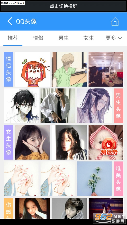 实用的头像软件,qq头像图片大全app中有着情侣、卡通等众多的精美头像,朋友们在使用一些软件的时候可以在比软件中挑选自己喜欢的图片来设置成头像,有需要的朋友可以下载试试。