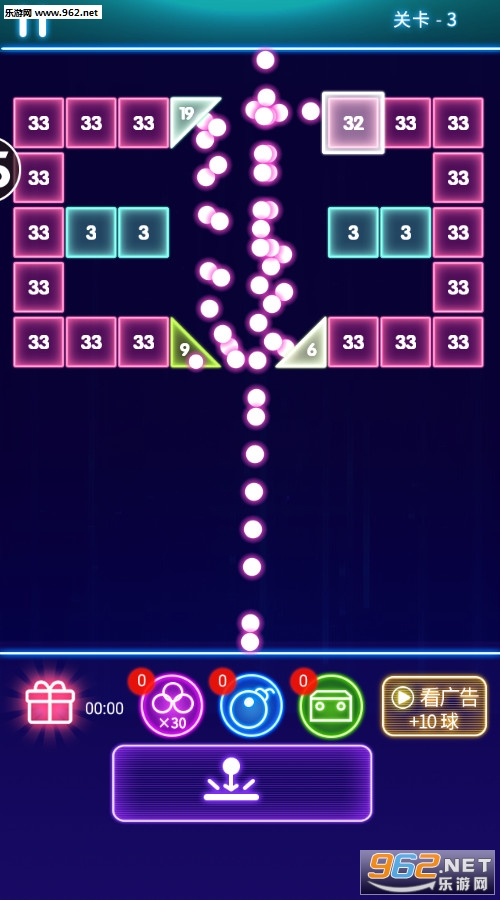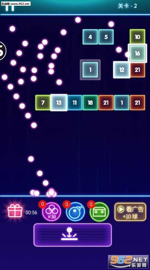 3.通过在关卡中射击方块能够获得掉落的道具玩家通过拾取加快小球速度。