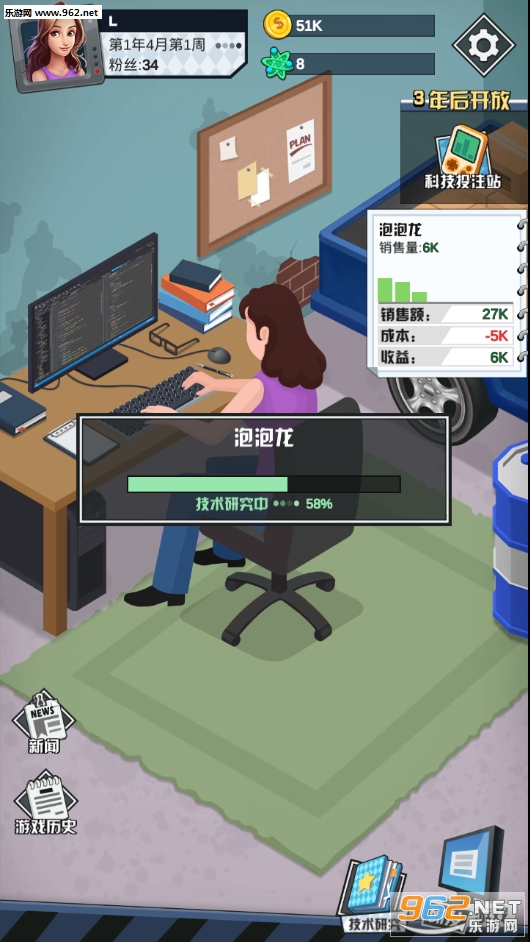 这是一款纯粹的游戏研发模拟类游戏,刚开始玩的时候可能会略显得简单,其实在前期需要通过合理的主题+类型搭配来研制游戏获得较高收入,这样才不会在每个月的硬核开支成本下破产。