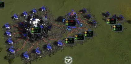 请看上图,战斗刚刚开始,大家都知道开局对一场战斗的重要性,速度就是生命,现在我想让ACU不停地建造2个MASS采集器,3个发电厂,1个陆军工厂,我可以先按住[Shift]键不放,然后在建筑菜单中选择那几个建筑,依次摆放到你想要的位置,松开[Shift]键,这样ACU就会按照你给他指定的建造顺序,把这几个建筑都造好,如果你想改变刚才的摆放位置,可再次按下[Shift],按住那个建筑拖动即可。如果你脑中已有了一个明确的开局方式,你甚至可以一直按着[Shift]键,让ACU把整个开局方式全部摆上去,然后按照指定的路线去巡逻,这些过程只要按一次[Shift]就能全部搞定。