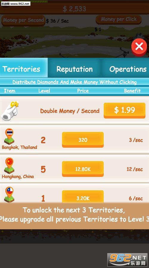 《钻石大亨》(Diamond Mine Tycoon)是一款放置类的休闲游戏,游戏中玩家扮演一名矿业公司的老板,你需要实用各种手段来提高出售钻石获得的收益。规划发展路线,做出你的判断,扩大规模,使你日进斗金。赶快来成为钻石大亨吧。