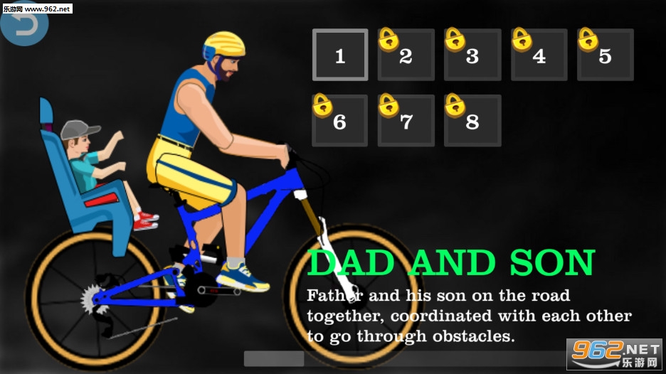 《快乐车轮2官方版》(Happy Game 2)是一款画面简约的自行车平衡闯关游戏,游戏中一位父亲骑着自行车带着孩子在危险的道路上行驶,玩家可以通过左下角的按钮来控制前后的重心,通过右下角的按钮来控制前进还是后退,注意躲避钉刺等陷阱。