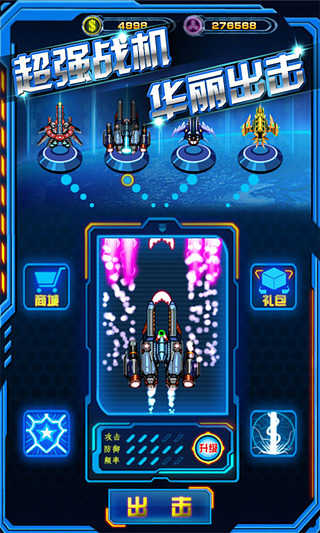 2、多样战机随心选择,绚丽弹幕铺满整个屏幕;