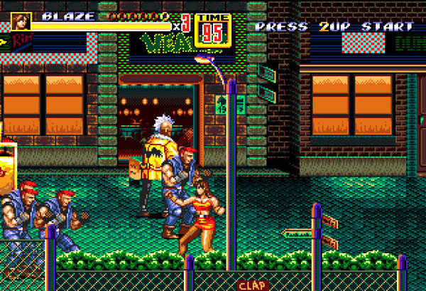 在1992年,《怒之铁拳》的续作终于出现了。日版名叫BARE KNUCKLE II――死斗者的镇魂歌”,欧美版名叫STREETS OF RAGE2”。我们把它缩写为BK2和SOR2。许多玩家第一眼看到这部作品时,简直有惊艳的感觉。这已经不是普通意义上的续作,而是一部脱胎换骨的作品。短短一年的时间竟然制作出如此高水准的作品,看得出制作者是在拿街机的标准来要求本作,充分吸收了CAPCOM经典街机动作游戏的精华,并加入自己的许多创意。BK2采用了新技术,游戏容量为16M,这也是当时MD卡带的最高容量。