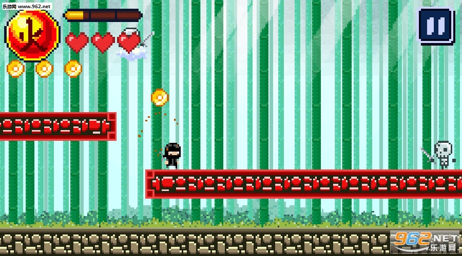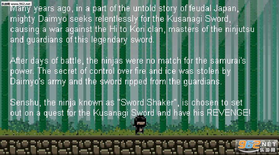 游戏中玩家能体验到经典趣味像素冒险世界的完美乐趣, 你需要打败敌人克服困难,获得最后的胜利,游戏是一个忍者世界,玩家作为一个忍者可以在树林中使用二段跳躲避攻击或是前进,用手里剑攻击敌人,冲破阻碍。