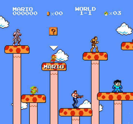 4、这款融合版的马里奥不仅有马里奥兄弟,还有魂斗罗、恶魔城、塞尔达等经典游戏角色乱入,这种组合感觉非常不错。