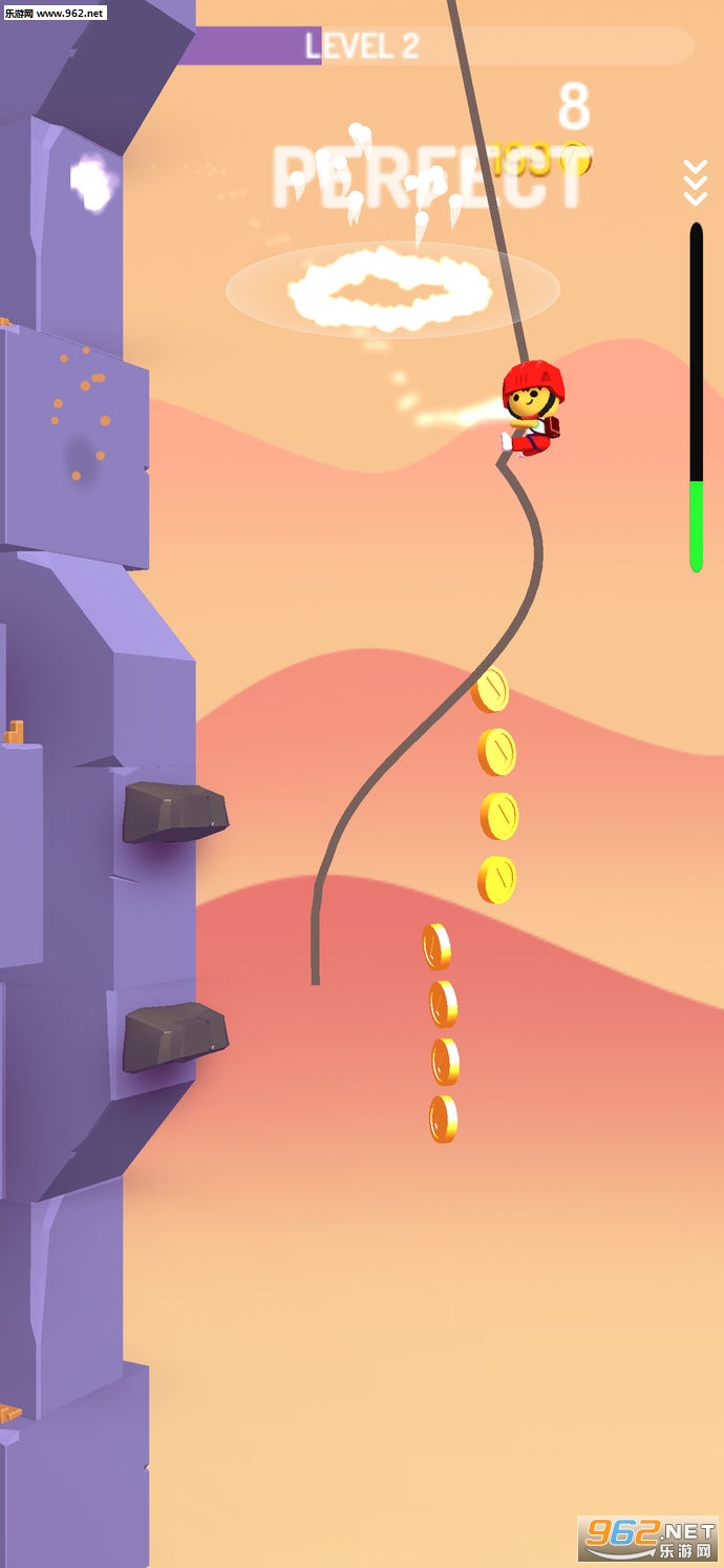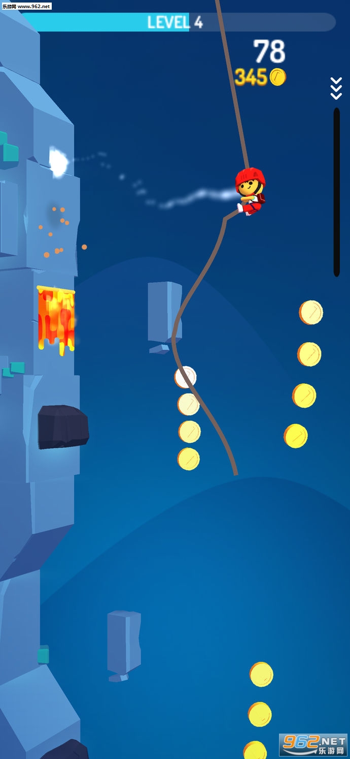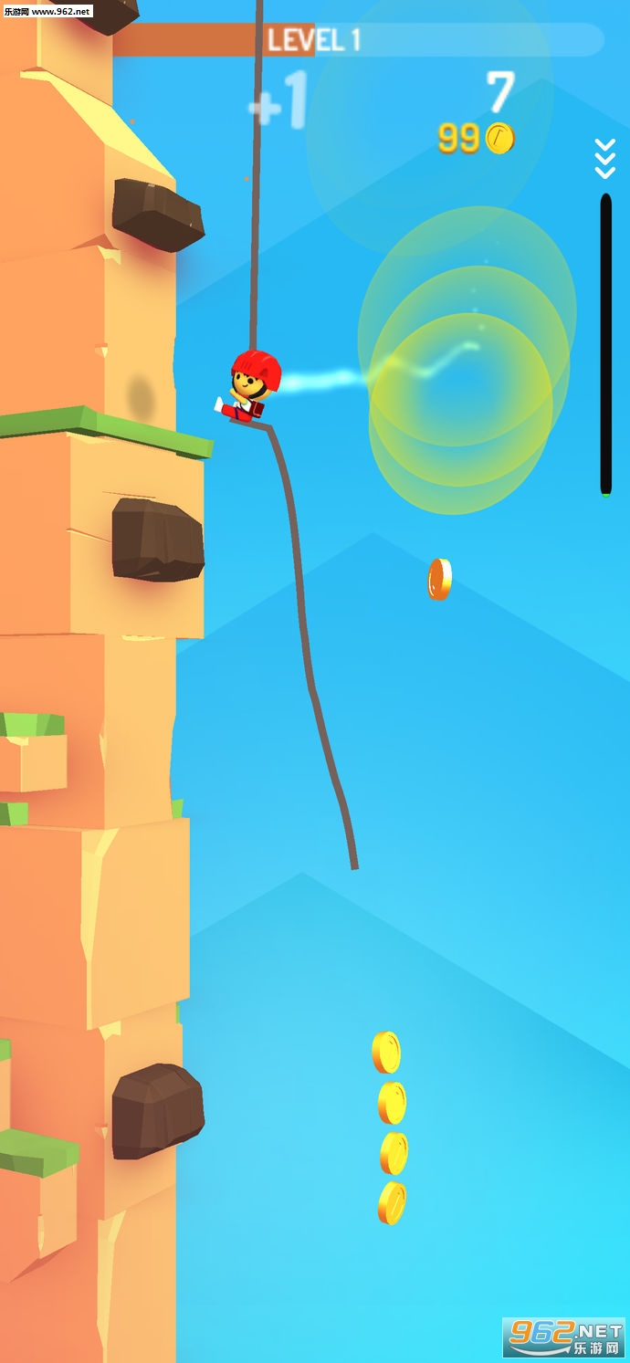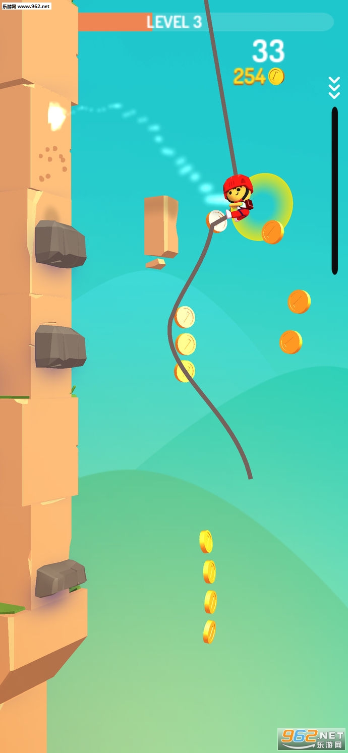 2、自由变换的地图画面,让这个勇敢的闯关小人,更加自由而灵活的出现在你悬挂的悬崖之上,成为攀岩的高手,收集更多的金币,完成精彩的冒险。