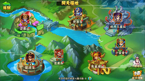 洞天福地的入口位于游戏主页的“秘穴”中,点击即可进入。洞天福地共有7个修炼场所,每达到一定等级时便会解锁相应的修炼场所,解锁后便可发起挑战,挑战成功后就可以在此场所进行修炼了。