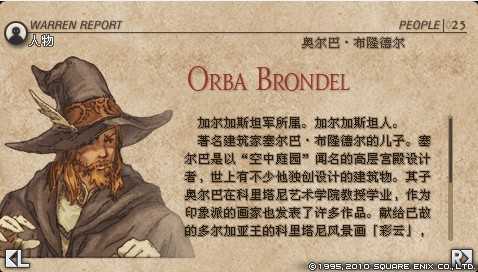 6.兰斯洛·塔尔塔罗斯(Lanselot Tartaros):种族:罗迪斯人(Lodis);年龄:38岁;生日:地龙之月22日;简介:位在北方大陆的罗迪斯教国为了回应与巴克拉姆的指导者布兰达的密约,而被派送到法雷利亚岛的教皇直属最强骑士团暗黑骑士团罗斯罗利安”(The Dark Knights,Roslolian)的总长,据猜测他可能是教皇的左右手。