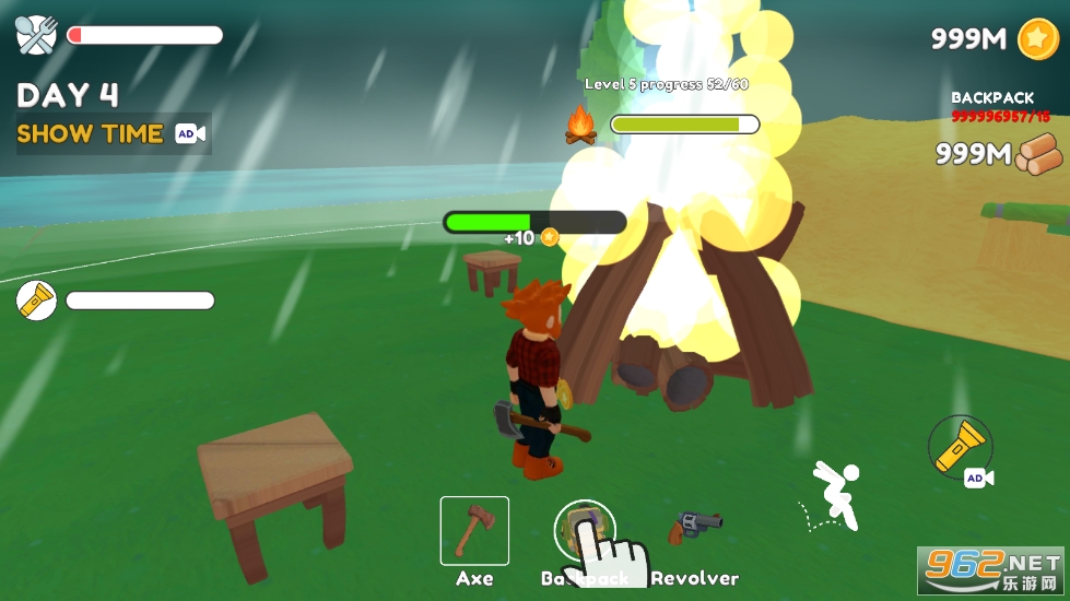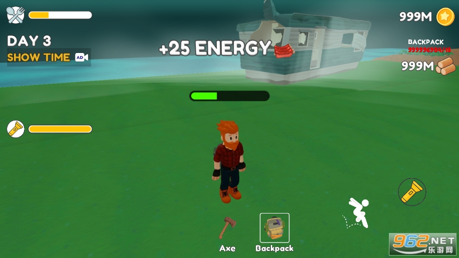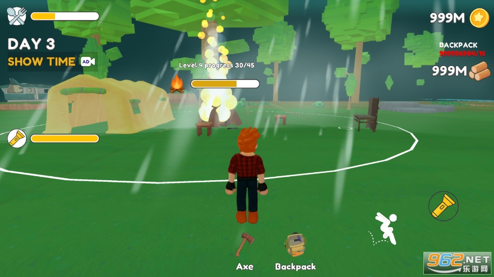 进入游戏,移动角色,使用斧头砍树收集木头