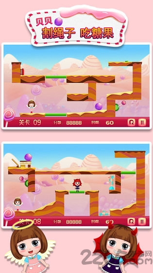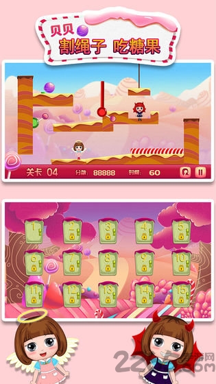 贝贝割绳子吃糖果是一个儿童益智休闲的免费软件,熟悉的玩法,综合了智力考验、脑筋急转弯、解谜等.趣味解密、智力闯关,神秘冒险之旅一定要小心哦、不要让糖果落入小恶魔的手里,快来一起挑战吧!