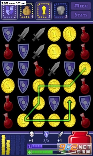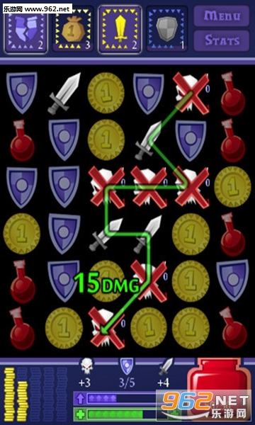 地牢突袭和一般宝石游戏不同的地方在于最少需要三个相同物件作连线,最多可以到整个画面是一样的物件的话皆可进行连线。 而连线的条件也不像一般宝石游戏一样是规则的直线或是横线,而是可以进行45度进行上下排的串连。