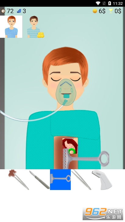首先,要观察一下手术中需要的道具和操作,胃部肿瘤切除手术主要有使用手术钳,手术刀,针,激光,涂药消毒,抽吸六种操作。接下来,我们需要使用手术刀将肿瘤进行切除。如果拿错了工具,游戏内也有提示会告知,在完整完成几台手术之后,就需要完全你自己独立操刀,还是非常具有可玩性的。