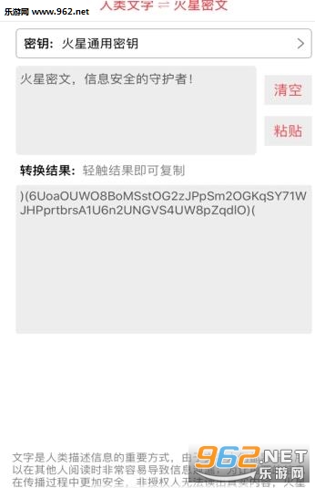 火星密文是一款非常好用的手机资料加密软件。支持自定义密钥以及火星通用密钥两种加密方式,通用密钥所有火星密文app均可打开,适合朋友间传递重要信息,自定义密钥保密程度极高,轻易无法解开。