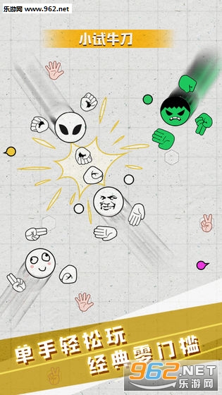 《猜拳吧小老弟游戏》是一款画面简约的以猜拳为战斗题材的竞技休闲手游,游戏中玩家可以选择各种不同的小球皮肤进行体验,小球的周围会环绕这剪刀石头布,可以直接攻击对方的本体击败对方,也可以利用石头来撞击对方的剪刀、步撞击石头、剪刀撞击步来击毁对方的防御。