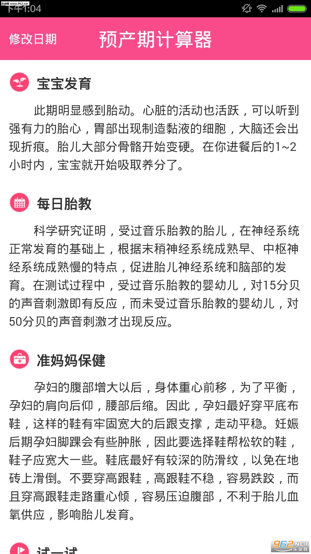 预产期计算器还提供孕期每一天的注意事项、行动指南、您的身体、宝宝的变化等相关知识。