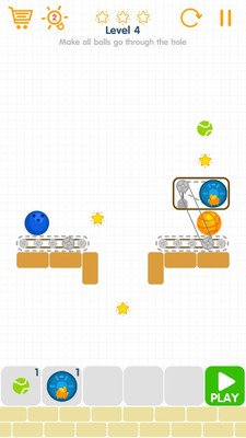 游戏越往后难度会越大,玩起来就会越烧脑,大家在游戏中需要通过移动板砖的方式来控制球球下落的路径,收集星星到达指定的位置,进行闯关!