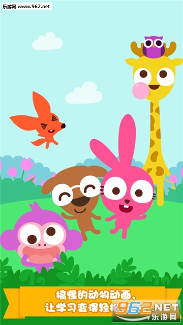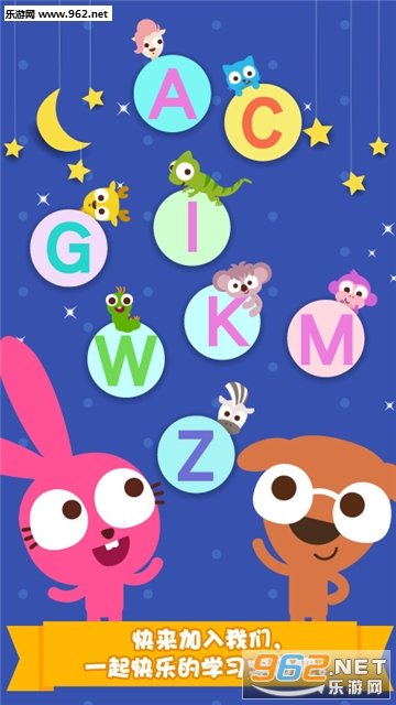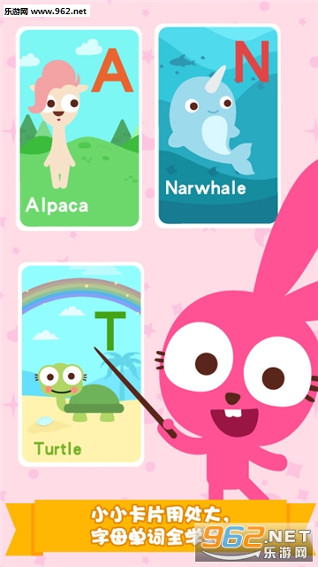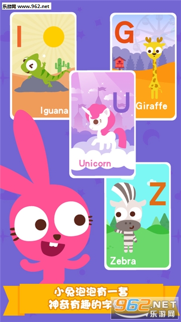 在《泡泡兔趣味字母卡》中学习和识别26个英文字母,和对应的26个可爱动物的单词!
