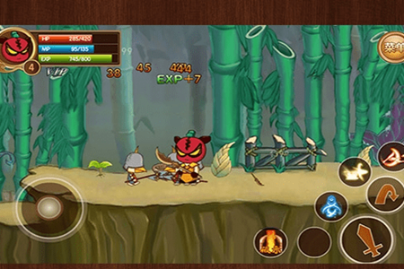 虚拟按键操作,屏幕左下方的箭头可以控制人物的走动方向,屏幕右下方是角色的动作控制区域,包括跳跃、普通攻击和技能,点击一次即可触发。