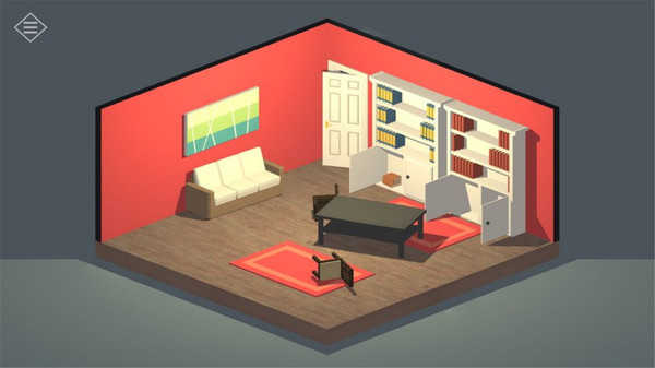 左右滑动可以切换视角,有些关键线索就藏在背后,所以要善于利用,比如第一个红房子里,在沙发背后有四个箭头,记住他们的方向,然后把柜子上的四个水滴状标志调成一样的方向就能打开了,里面有一把红色的钥匙。下面一个房间的床底下有一把遥控器,可以打开电视上的机关。