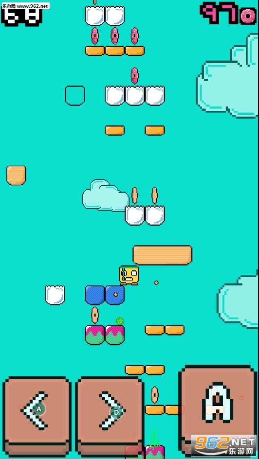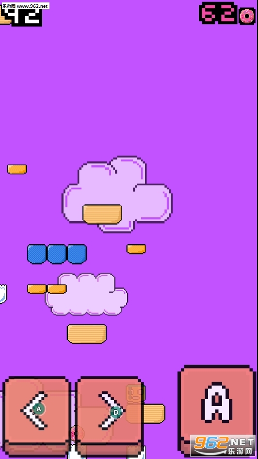 《rage jump游戏》一款简单像素画风的平台跳跃游戏!与以往的闯关小游戏不同的是,它是自下而上的攀登玩法,你需要控制画面中那个囧囧的方块脸在平台上收集红色和金色的宝石,跳得越高越高!方向键也显而易见的分布在了画面两侧。