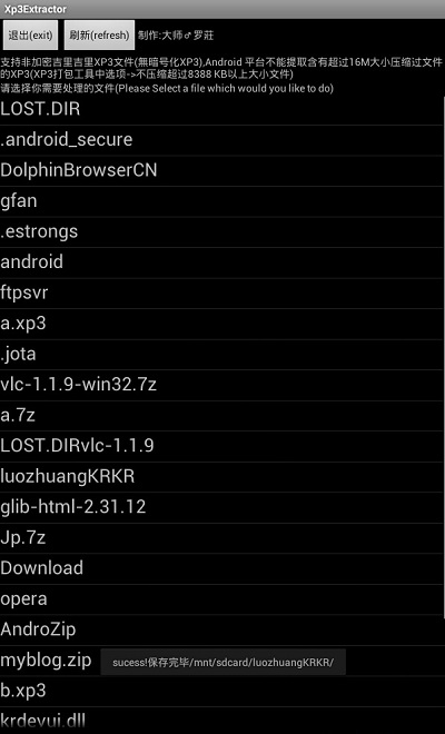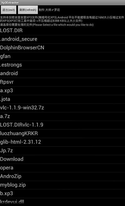 让你能够在安卓设备上玩你私人备份的手游。同人开发者也可以用它在安卓上测试使用吉里吉里2开发的手游而不用修改任何代码/脚本(如果你的手游没有使用任何自定义插件)。文件打包格式为xp3。本软件能提取吉里吉里所使用的xp3文件。
