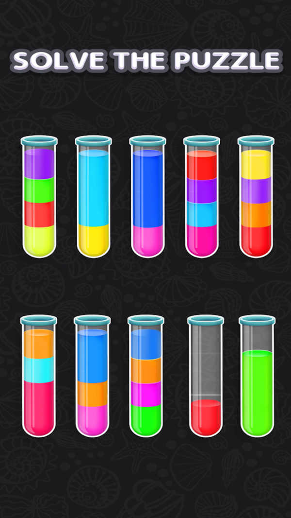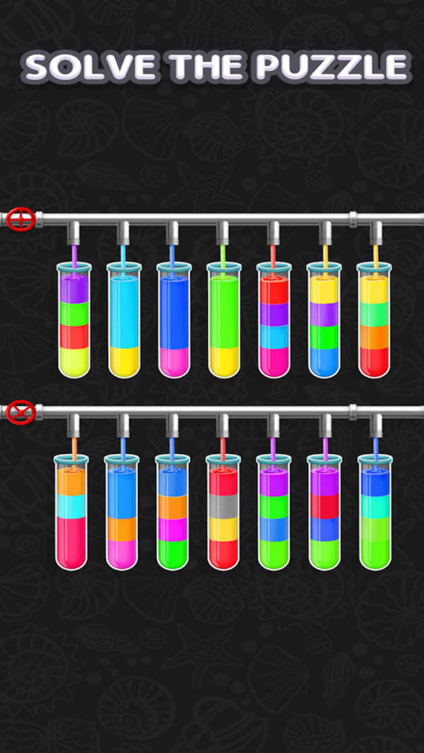 这种益智放松游戏有一个有趣的规则,即您只能在顶部倒入相同颜色的水,并且所倒入的管中有足够的空间。