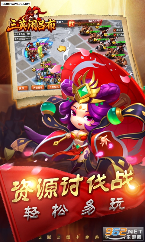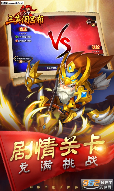 《三英闹吕布》是一款三国题材的卡牌策略手机游戏,它的主要特点是军团作战,横版对冲,强调布阵策略和临场技能释放,让你淋漓尽致的体验指挥千军万马的大将之风,秒杀以往枯燥乏味的自动战斗模式。玩家可以率领40来个各具特色的史诗英雄,包含几百种武将技能,指挥300名以上的单位同屏厮杀,缔造“军团对战”的史诗感。能感受到“一夫当关,万夫莫开”,“大将冲锋,如入无人之境”的爽感。游戏提供丰富的成长系统提升玩家战斗力,更有宝物道具助玩家一臂之力。