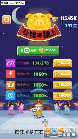 《收钱吧皇上游戏正式版》是一款非常容易上瘾的射击休闲游戏,简单的休闲画风,玩法上手轻松。玩家在游戏中选择自己喜欢的武器滑动品目进行射击,消灭所有的金猪。获取的元宝可以让你对自己的角色进行升级,喜欢的话就快来下载吧!