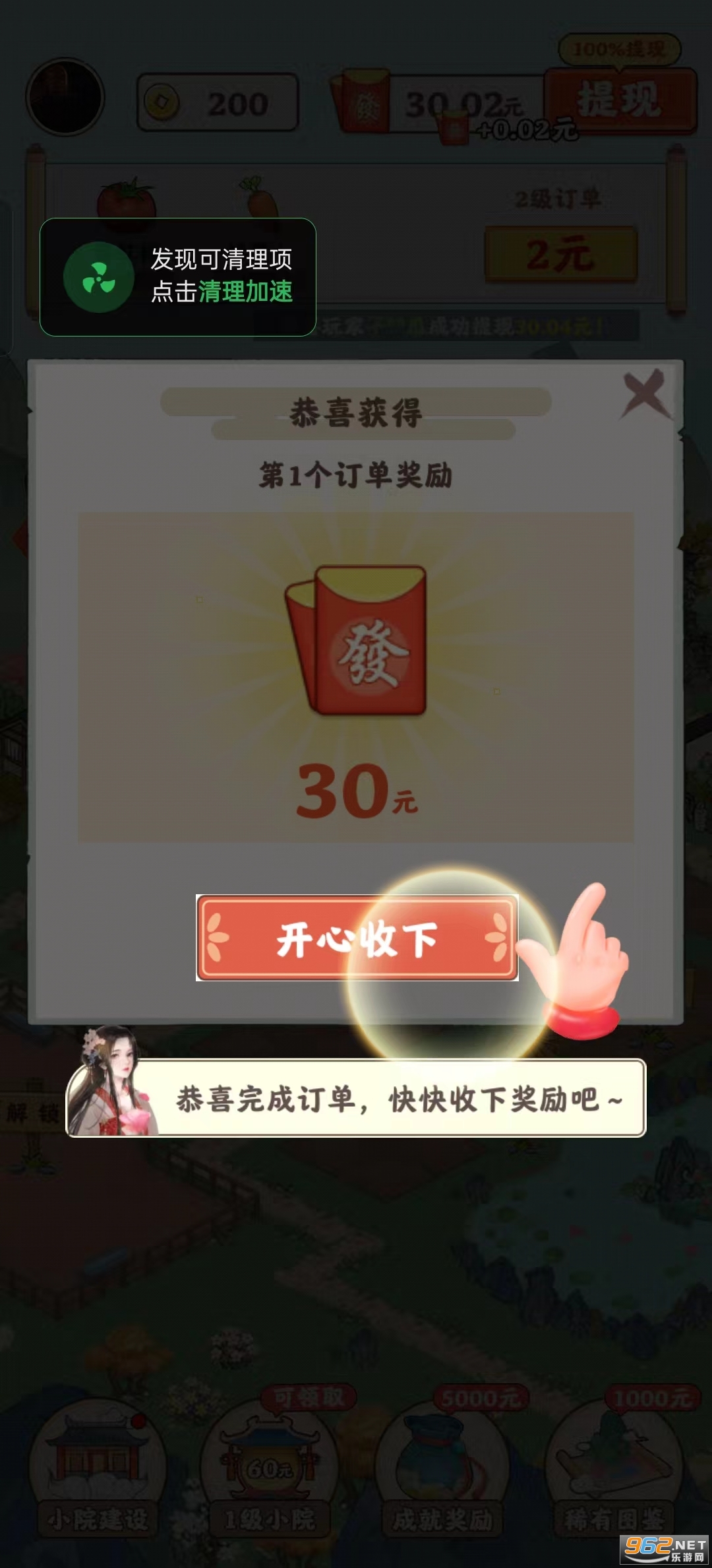 1、新人登陆后,简单体验后就能挣到几毛钱,之后在游戏中通过种植蔬菜水果、养鱼、升级小院以及收集稀有图鉴等方式能获得更多的红包奖励。