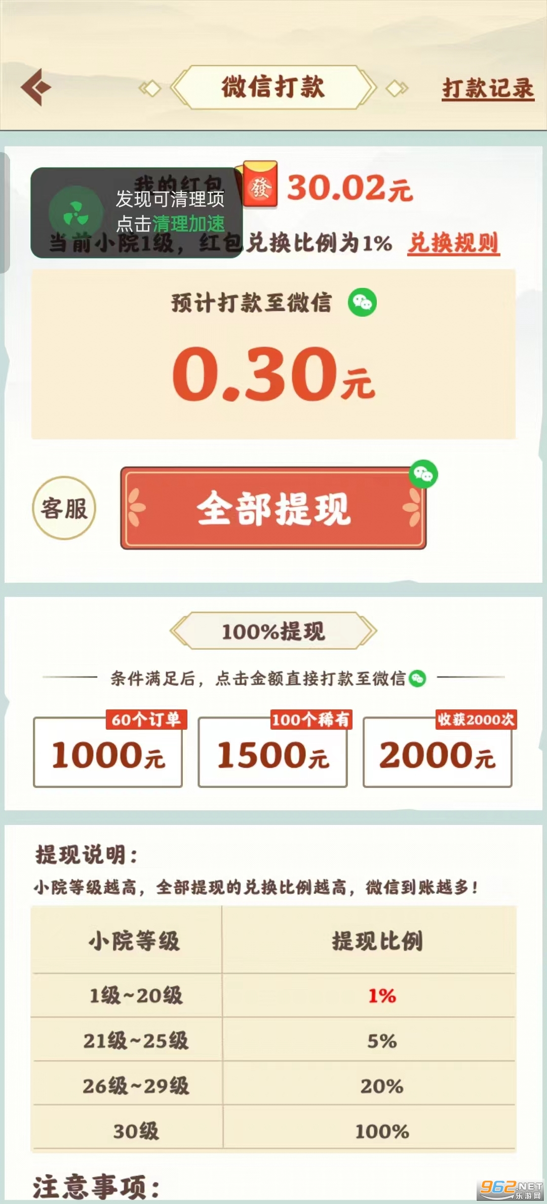 2、不过,有一点要注意,赚到了不见得就能100%提现,在江南小院里,获得的红包不能全部一次性提出来,有个提现比例,默认的比例是1%,就是说别看赚到了,实际上赚到100的话,提现到账只有1快而已。
