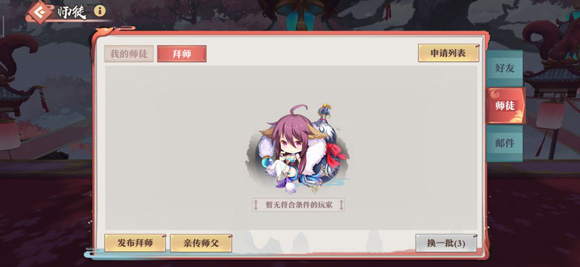 如果没有目标玩家拜师收徒怎么办呢?可以去师徒系统寻找系统推荐的玩家拜师收徒。