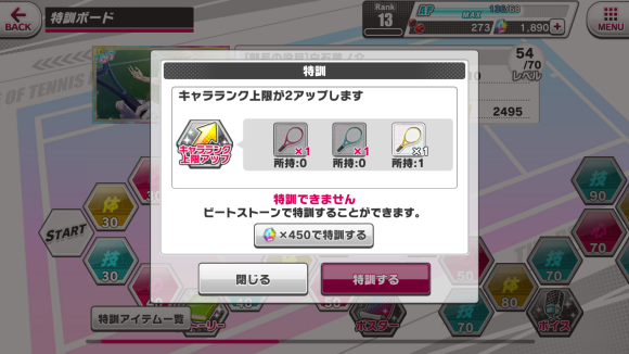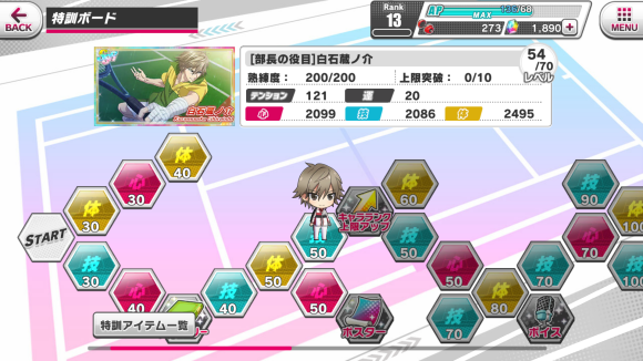 特訓アイテム一覧:特训道具一览,打歌可获得红色蓝色黄色的网球,球鞋,球拍。